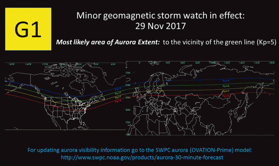 A G1 (Minor) Geomagnetic Storm Watch is valid for 29 November due to an anticipated combination of CME and CH HSS effects. A increase in likelihood for visible aurora should exist at night in the higher latitudes.