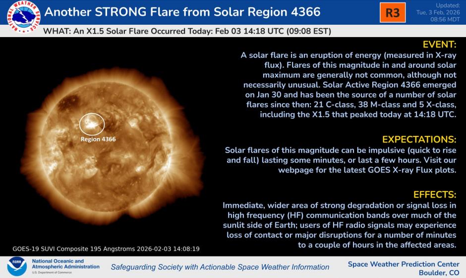 Solar active region 4366 continues to release strong solar flares, the latest was an X1.5 today at 1418 UTC. Since this region emerged on Jan 30, it already produced 21 C-class, 38 M-class and 5 X-class flares, including an X8.1 on Feb 01 that was accompanied by a Coronal Mass Ejection (CME) that may cause glancing influences near Earth on Feb 05-06. SWPC forecasters continue to monitor the Region 4366 closely.