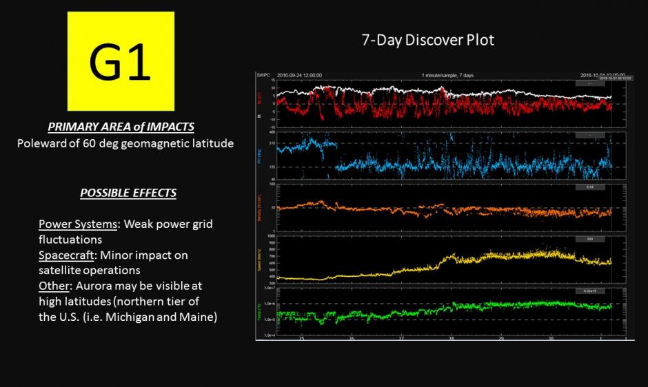 A G1 (Minor) Geomagnetic Storm Watch is in effect for 01 October 2016 due to continued effects from a recurrent, positive polarity, coronal hole high speed stream. This feature has been responsible for G1 and G2 (Moderate) storm conditions since 27 September. Stay tuned for further updates.