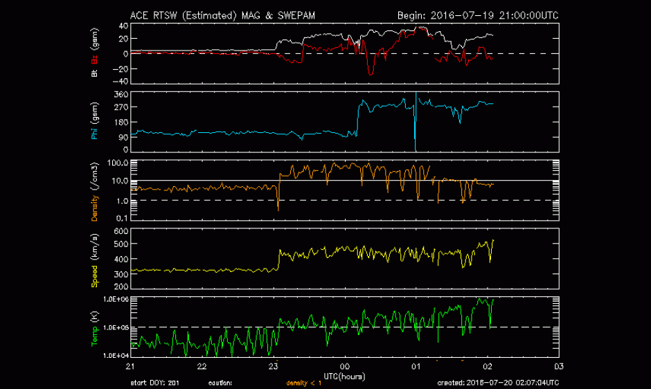 An interplanetary shock was observed at the ACE spacecraft at approximately 19/2310 UTC (07:10 PM Eastern). A geomagnetic sudden impulse was subsequently recorded at magnetometer sites around the globe at 19/2355 UTC (07:55 PM Eastern). G1-Minor geomagnetic storm conditions have been observed and G2-Moderate conditions are expected as a result of this CME arrival.