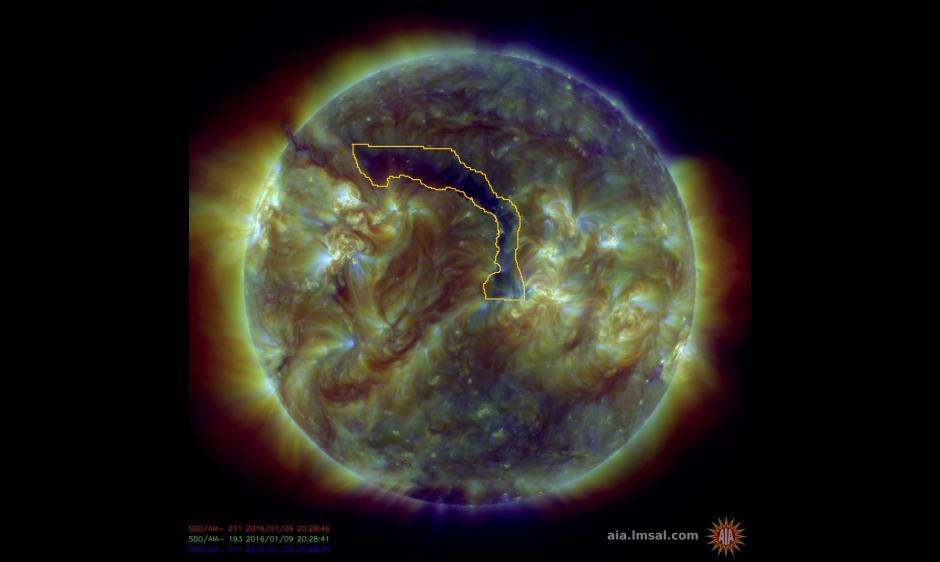 A G1 (Minor) geomagnetic storm watch has been issued for 12 January (UTC day) due to a recurrent, negative polarity, coronal hole high speed stream. Whenever we have high speed solar wind stream features that have been observed consistently for several rotations, it is more likely that isolated minor geomagnetic activity will occur. The image is a composite of several different wavelengths from NASA’s Solar Dynamics Observatory. The outline indicates the coronal hole we are tracking.