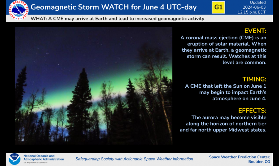 G1 Watch for Tuesday, June 4 published: Tuesday, June 4, 2024 21:12 UTC UTC A CME that left the Sun on June 1 may begin to impact Earth’s atmosphere on June 4.