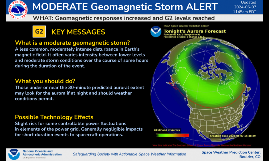 G2 Conditions Observed published: Friday, June 7, 2024 21:36 UTC UTC G2 level conditions were reached at 1456 UTC today.
