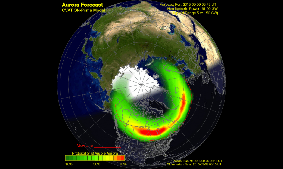 Following the G2 (moderate) geomagnetic storms from last night, observations of the solar wind at the ACE spacecraft near L1 indicate the potential again this evening for more activity. G1 (minor) conditions have already been observed by the global network of ground-based near real-time magnetometers. A forecast warning for G2 has been issue from 09/0500 - 09/1000 UTC (1am to 6am EST). These could be some prime hours to possibly see the Aurora in the northern most regions of the lower 48 states.  Update - As forecast, G2 conditions were observed at 09/0526 UTC (1:26 am EST). There have been reports of Aurora in S. Canada as well as northern states Minnesota, Wisconsin, and N. Dakota and Michigan.