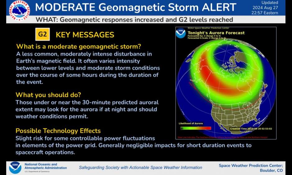 G2 (Moderate) Geomagnetic Storm Levels Observed published: Thursday, August 29, 2024 14:05 UTC UTC G2 (Moderate) geomagnetic storm levels were observed at 28/0259 UTC (10:59 Eastern) due to persistent CME effects.