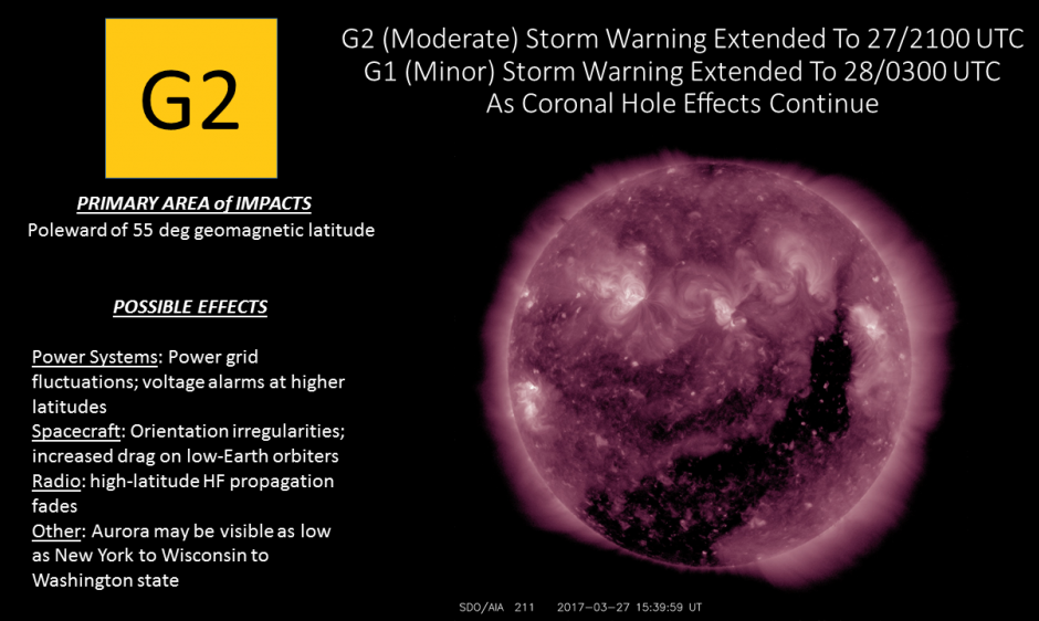 The G2 (Moderate) geomagnetic storm warning has been extended to 27 March at 2100 UTC (5:00 pm ET) and the G1 (Minor) geomagnetic storm warning has been extended to 28 March at 0300 UTC (27 March 11:00 pm ET) as coronal hole high speed stream effects continue. Stay tuned for updates!
