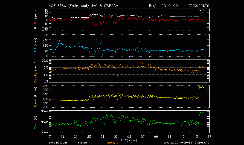 The second of the expected coronal mass ejections (CMEs) has arrived, and arrived in good agreement with the predicted arrival times (shown here in this ACE solar wind plot as the strong discontinuity near the end of the graph). As expected, an initial looks shows this CME is stronger than the first. G2 (Moderate) storming is underway now and the forecast for G3 (Strong) storming on the 13th still looks reasonable. The solar radiation storm that is in progress as a result of the eruption on September 10th peaked briefly, as it often does with the passage of the shock, but is currently below the S2 threshold and in decline.
