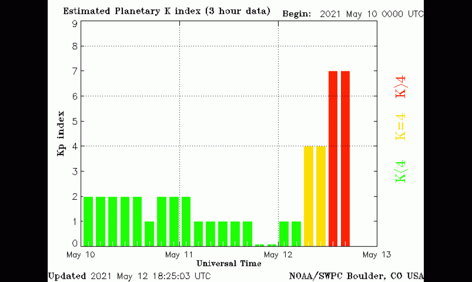 An interplanetary shock was observed at the DSCOVR spacecraft at 12/0547 UTC, announcing the arrival of the forecasted 09 May CME. This observation was followed by a 51 nT sudden impulse at the Fredericksburg Geomagnetic Observatory (FRD) at 12/0643 UTC. G3 (Strong) geomagnetic storm conditions were observed at 12/1258 UTC (6:58 AM MDT) and 12/1759 UTC (11:59 AM MDT). The G3 Warning is valid until 12/2359 UTC (5:59 PM MDT). Stay tuned to this website (https://www.swpc.noaa.gov/) for additional updates as forecasters continue to manage this geomagnetic activity.