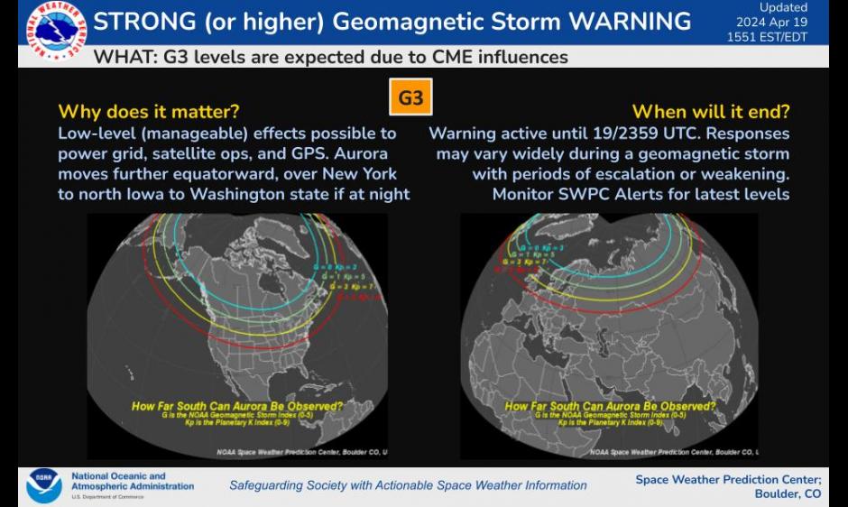 G3 (Strong) geomagnetic storm levels were reached at approximately 19/1951 UTC. Strong or higher geomagnetic storm levels are expected to continue for the remainder of 19 Apr.