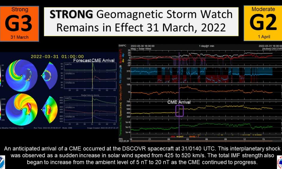 A G3 (Strong) geomagnetic storm watch remains in effect for the remainder of 31 March. Additionally, the G2 (Moderate) watch continues in effect for 1 April as Coronal Mass Ejection (CME) progression continues. The CME arrived at the NOAA DSCOVR spacecraft, about 1 million miles from Earth, on 30 March 9:40 pm EDT (31/0140 UTC); detected as an interplanetary shock. CME arrival at Earth was noted in the planetary magnetometer network as a sudden impulse 30 minutes later at 10:10 pm EDT (31/0210 UTC). G1 (Minor) storm levels were reached shortly afterwards. Enhanced solar wind conditions continue to show the potential for elevated geomagnetic responses to the G2-G3 levels. Any prolonged or pronounced southward shift in the interplanetary magnetic field (IMF) could quickly escalate geomagnetic reactions to storm levels. Continue to follow our webpage for the latest forecasts, information, and updates.