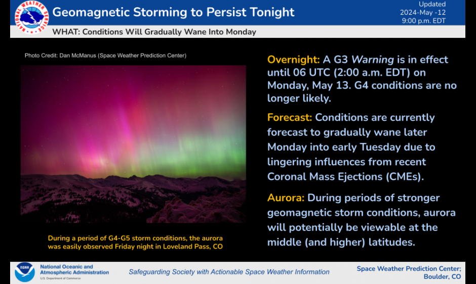 Geomagnetic Storming to Persist Tonight published: Monday, May 13, 2024 12:20 UTC UTC Conditions are expected to gradually wane into Monday.