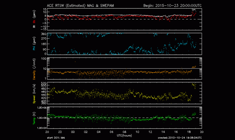 The anticipated arrival of the 22 Oct coronal mass ejection (CME) arrived at the ACE satellite at 24/1828 UTC (24/1228 MDT). The passage of the CME is likely to result in periods of G1 (Minor) geomagnetic storms for the remainder of 24 Oct through early 25 Oct. Stay tuned for further developments.