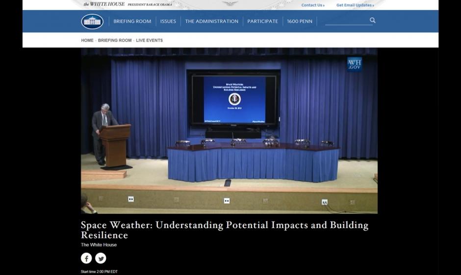 The White House Office of Science and Technology Policy (OSTP) will host an event on October 29, 2015 from 2:00-4:30 pm ET at the Eisenhower Executive Office Building on "Space Weather: Understanding Potential Impacts and Building Resilience." The event will feature speakers from the Federal Government, industry, academia, and Congress and announcements about new Administration efforts related to space weather.
