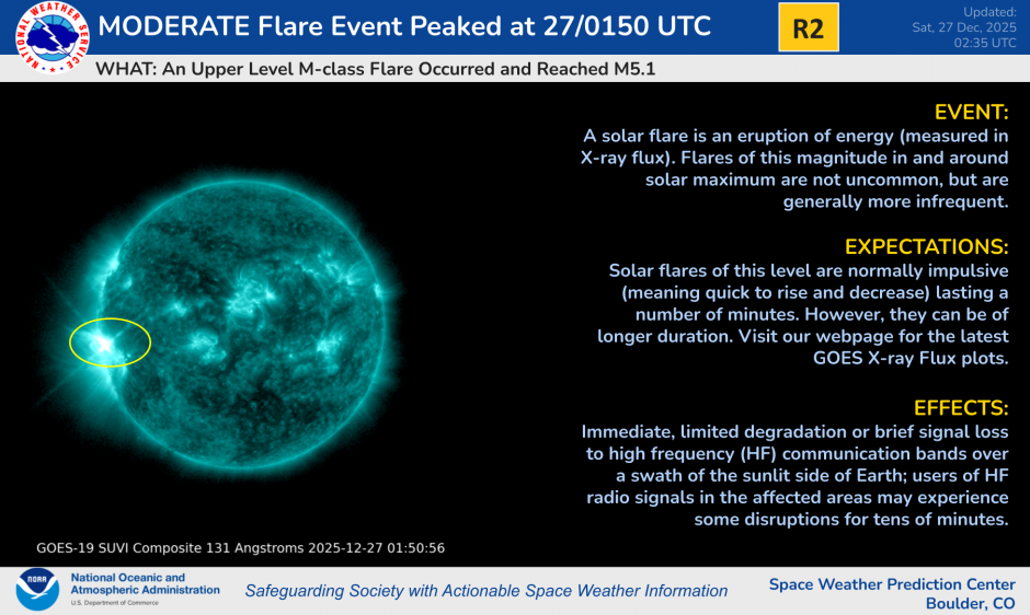 An M5.1 flare occurred at 27/0150 UTC. This event appears to originated from a new active region just NW of AR 4323. Stay tuned for the 1230 UTC forecast for more information concerning this region and event.