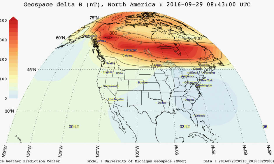 SWPC deployed experimental products from the new operational Geospace model on Oct 5th. This model provides short-term guidance of the state of Earth’s magnetosphere using real-time solar wind data and F10.7, a solar EUV proxy, as input. The model also provides for the first time regional guidance of geomagnetic activity. Multiple product web pages are available including: a Global Geomagnetic Activity Plot, Equatorial and Meridional Magnetospheric Views and Ground Magnetic Perturbation Maps. The Global Activity Plot provides recent history of geomagnetic activity along with a short term (15-45 minutes)  prediction of upcoming activity.  The Equatorial and Meridional Views of the Earth's magnetosphere show graphical output for three different plasma parameters (velocity, density, and pressure). These graphic cut planes of the magnetosphere are useful for providing a large-scale, global context of geomagnetic activity in the near-Earth environment.  The Ground Perturbation Maps display the gridded magnetic variations on a five by five degree global grid. These maps are useful for providing regional disturbance predictions that can be used by power grid operators to determine if disturbances are likely to have impacts at their general location. All three pages are currently hosted on our experimental products pages for customer evaluation before being promoted formally to operations. Promotion to operations is planned for early 2017. Comments on this new model and its products can be provided at SWPC's feedback page.