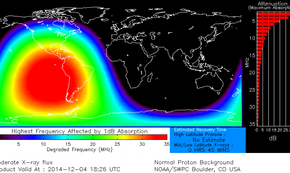 Despite a quiet past, Region 2222 produced a R2 - moderate solar flare today. There were no immediate indications that a CME occurred with this event. The impacts from this event transpired as a Solar Radio Blackout, which affects HF radio communications (3-30 MhZ) on the daylight side of Earth at the time of the flare. In this instance, without additional flares, the impacts should last under an hour. Depicted here a model plot showing what the impact area would have been as the flare occurred, and the affected frequencies.