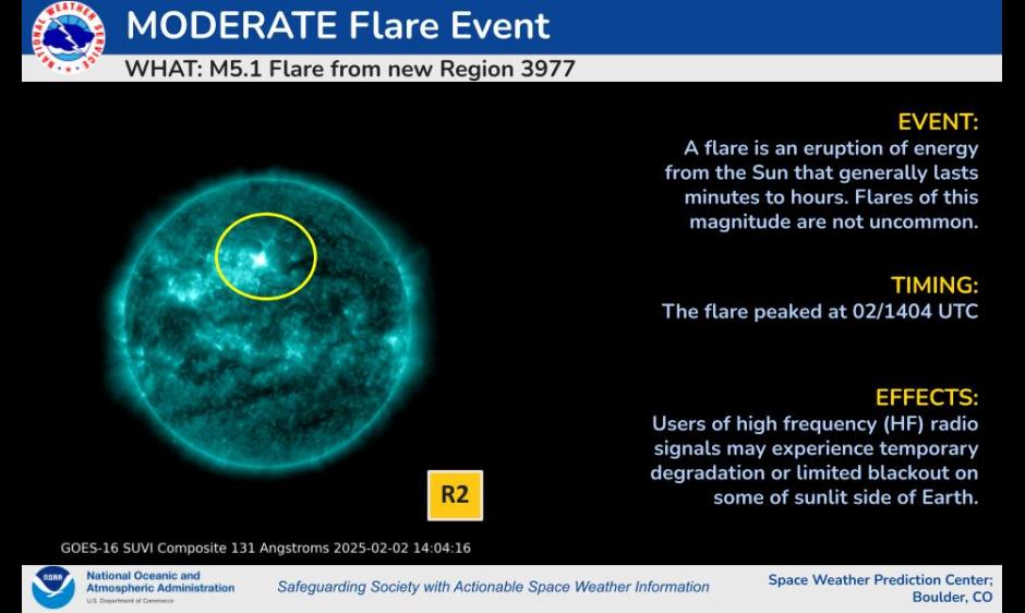 Region 3977 produced an impulsive M5.1 flare at 02/1404 UTC. Additional R1-2 (Minor-Moderate) flare events are likely to continue over the next several days. Be sure to visit https://www.swpc.noaa.gov/products/3-day-forecast to stay up to date with the latest 3-day forecasts.