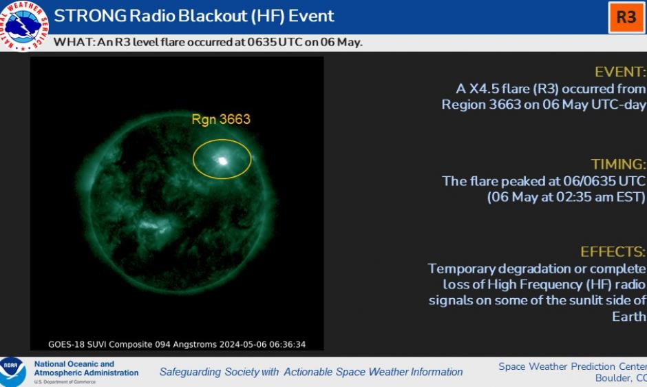 R3 (Strong) HF Radio Blackout Event 06 May, 2024 UTC-Day published: Monday, May 6, 2024 17:00 UTC UTC An R3 level flare occurred at 0635 UTC on 06 May due to flare activity from Region 3663.