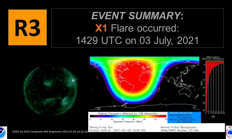 New Region 2838 produced an impulsive X1 flare (R3 - Strong Radio Blackout) at 14:29 UTC on 03 July. This sunspot region developed overnight and was also responsible for an M2 flare (R1 - Minor Radio Blackout) at 07:17 UTC on 03 July.