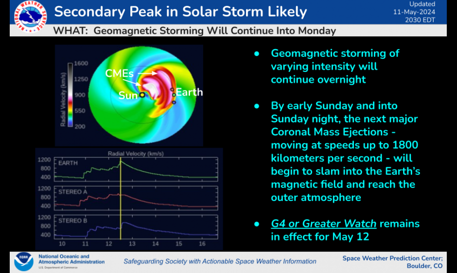 Forecasters are still expecting a secondary peak in the current solar storm.