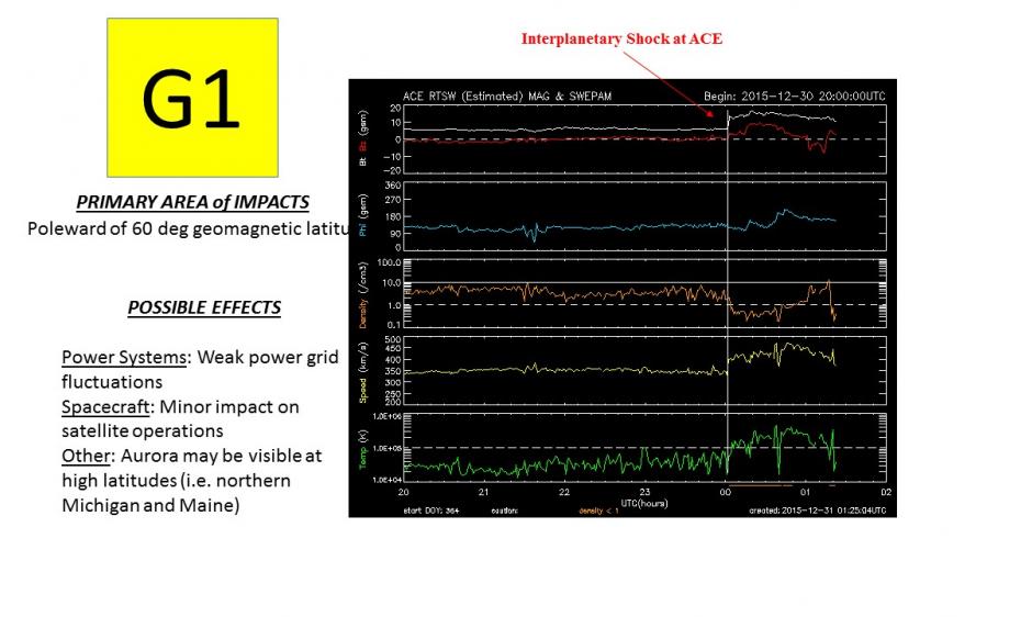 An interplanetary shock arrived at the ACE satellite on 31 Dec/0002 UTC (30 Dec/1702 EST) associated with the expected arrival of the 28 Dec coronal mass ejection (CME). At 31/0051 UTC, magnetometers around the globe recorded a geomagnetic sudden impulse ranging in strength from about 20-35 nT signaling the arrival of the CME at Earth. Magnetometers are currently recording unsettled to active conditions. A G1 (Minor) Warning is currently in effect along with a G3 (Strong) Watch for 31 December. Stay tuned here for further updates as this event evolves.