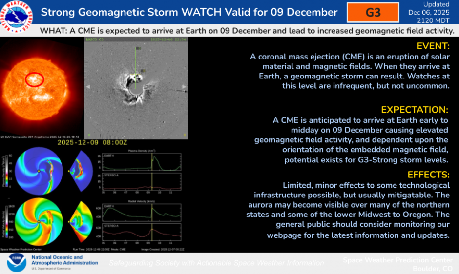 Strong (G3) Geomagnetic Storm WATCH Valid for 09 Dec 2025