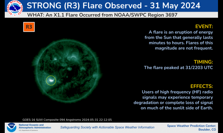 Strong (R3) Flare Activity Observed - 31 May 2024 published: Monday, June 3, 2024 13:49 UTC UTC SWPC Region 3697 produced an impulsive X1.1/2b flare (R3/Strong) at 31/2203 UTC.